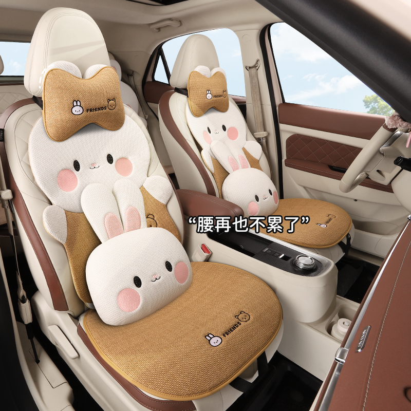 汽车女士可爱小兔子坐垫五座立体棉麻车垫四季通用透气垫耐脏单座